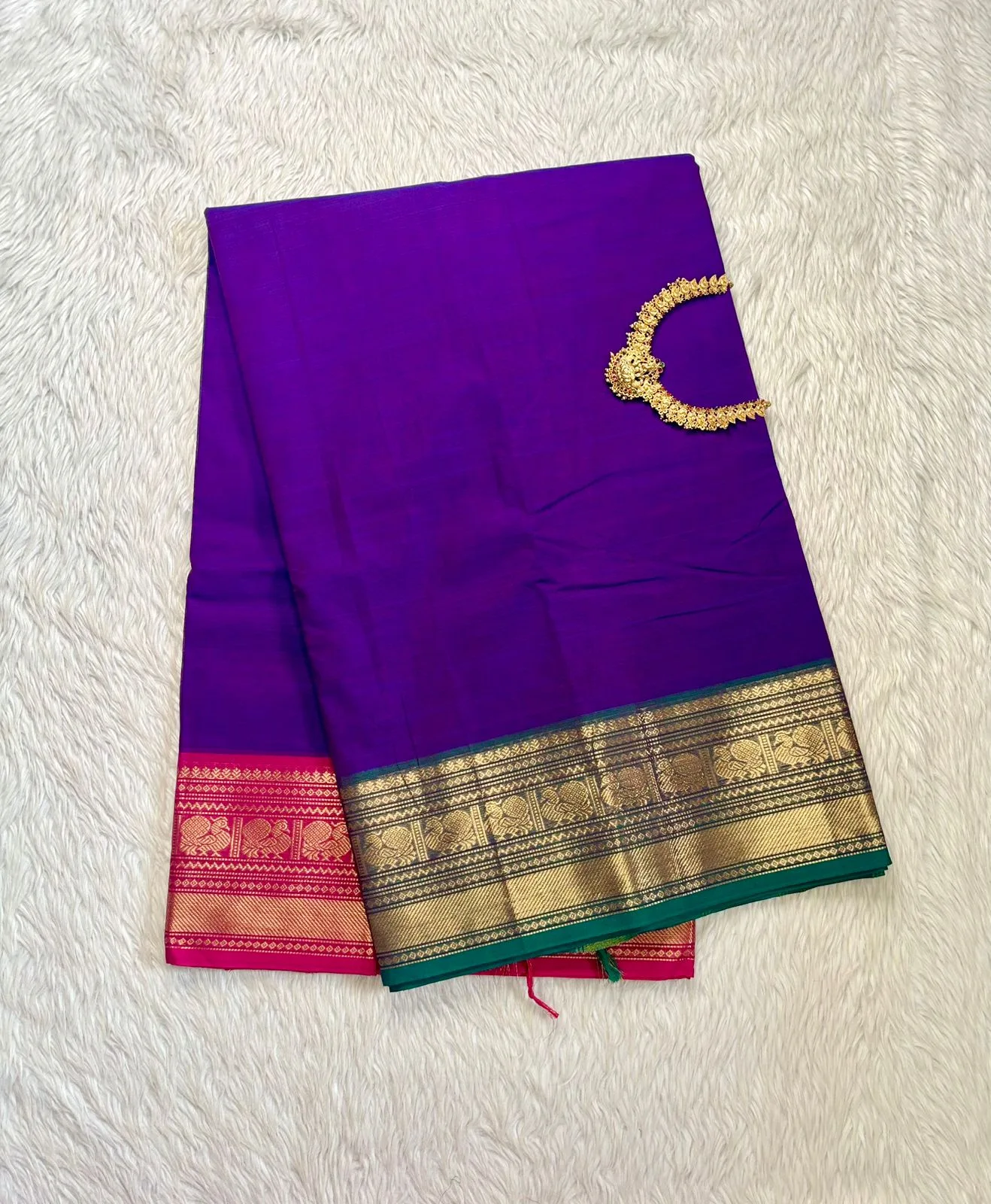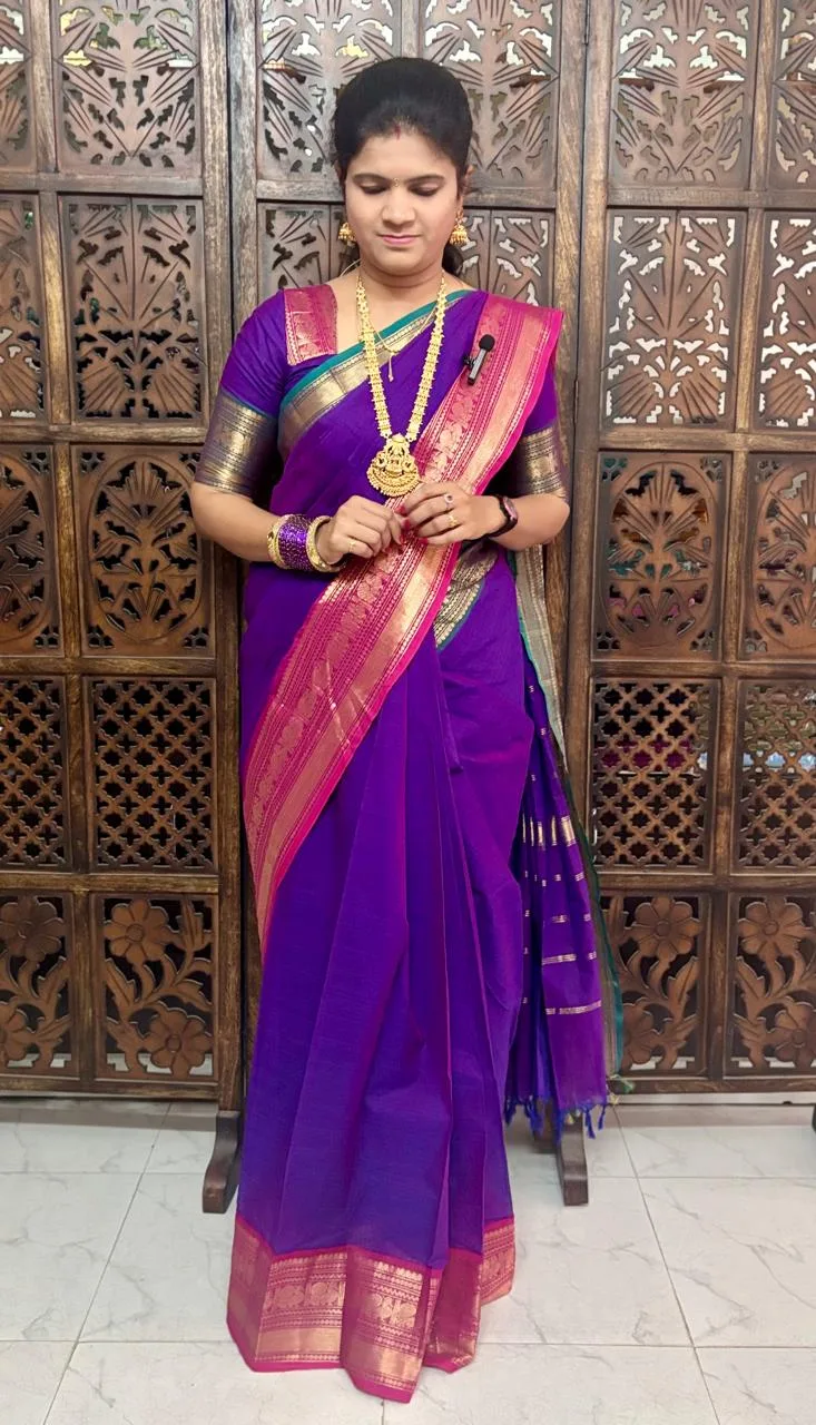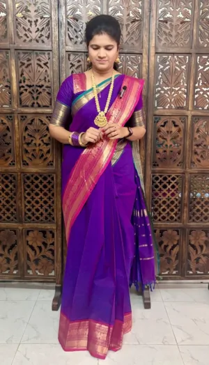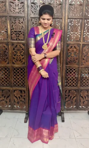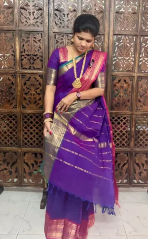 kanchi cotton saree with Running Blouse – Kanchi cotton – Ganga Jamuna Border -Purple Plain