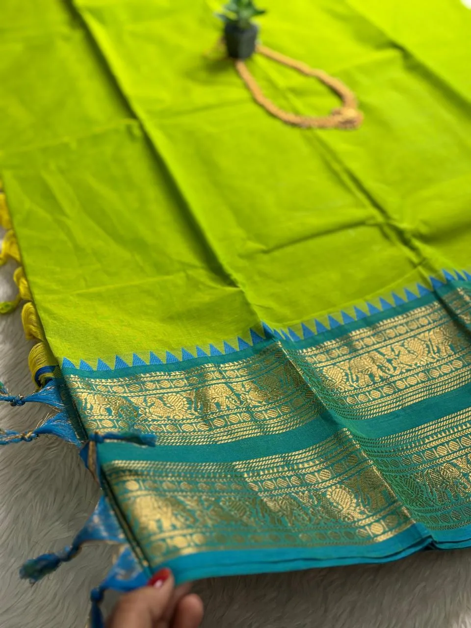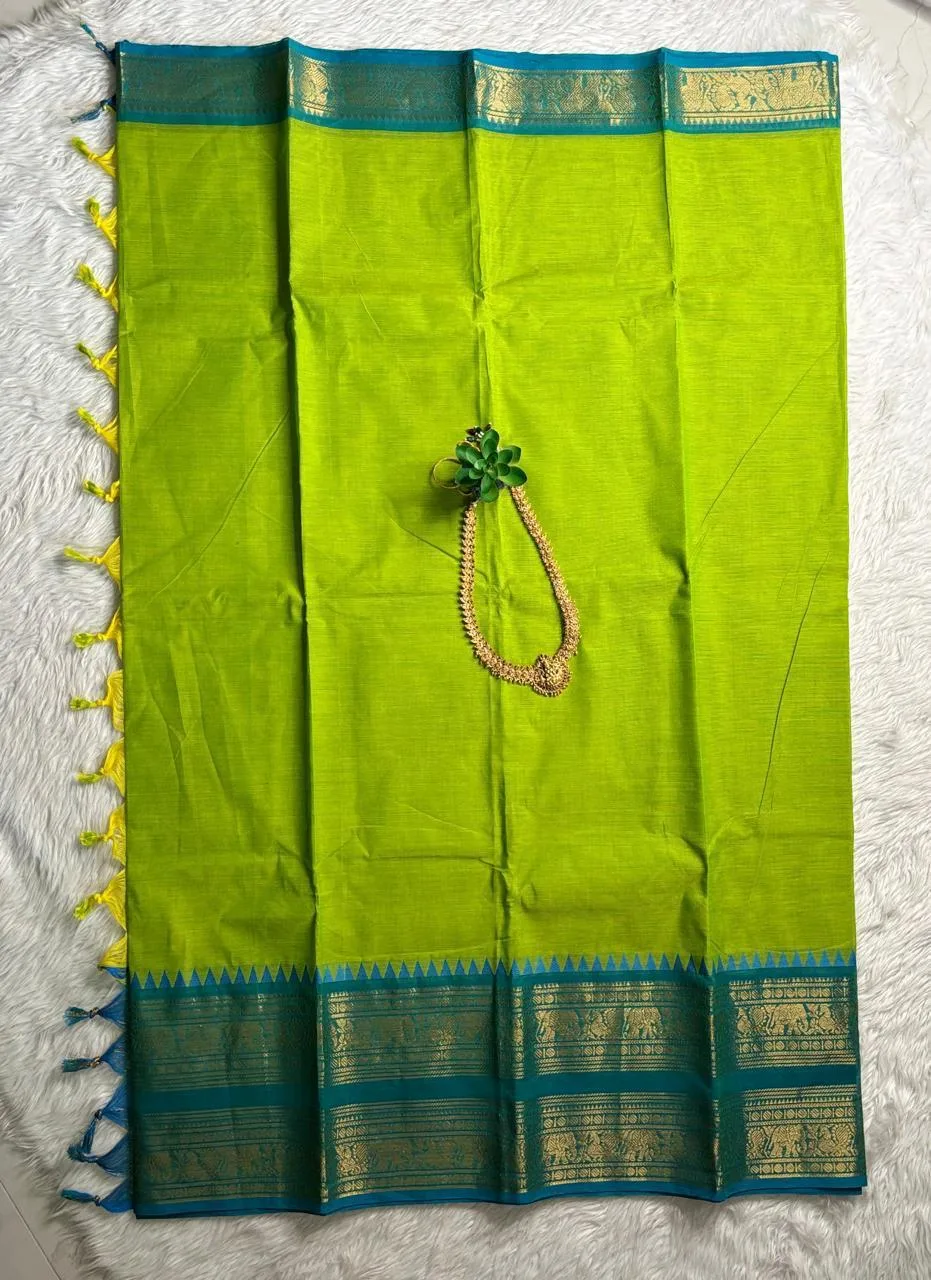 kanchi cotton saree with Running Blouse- Kanchi cotton- Parrot Green