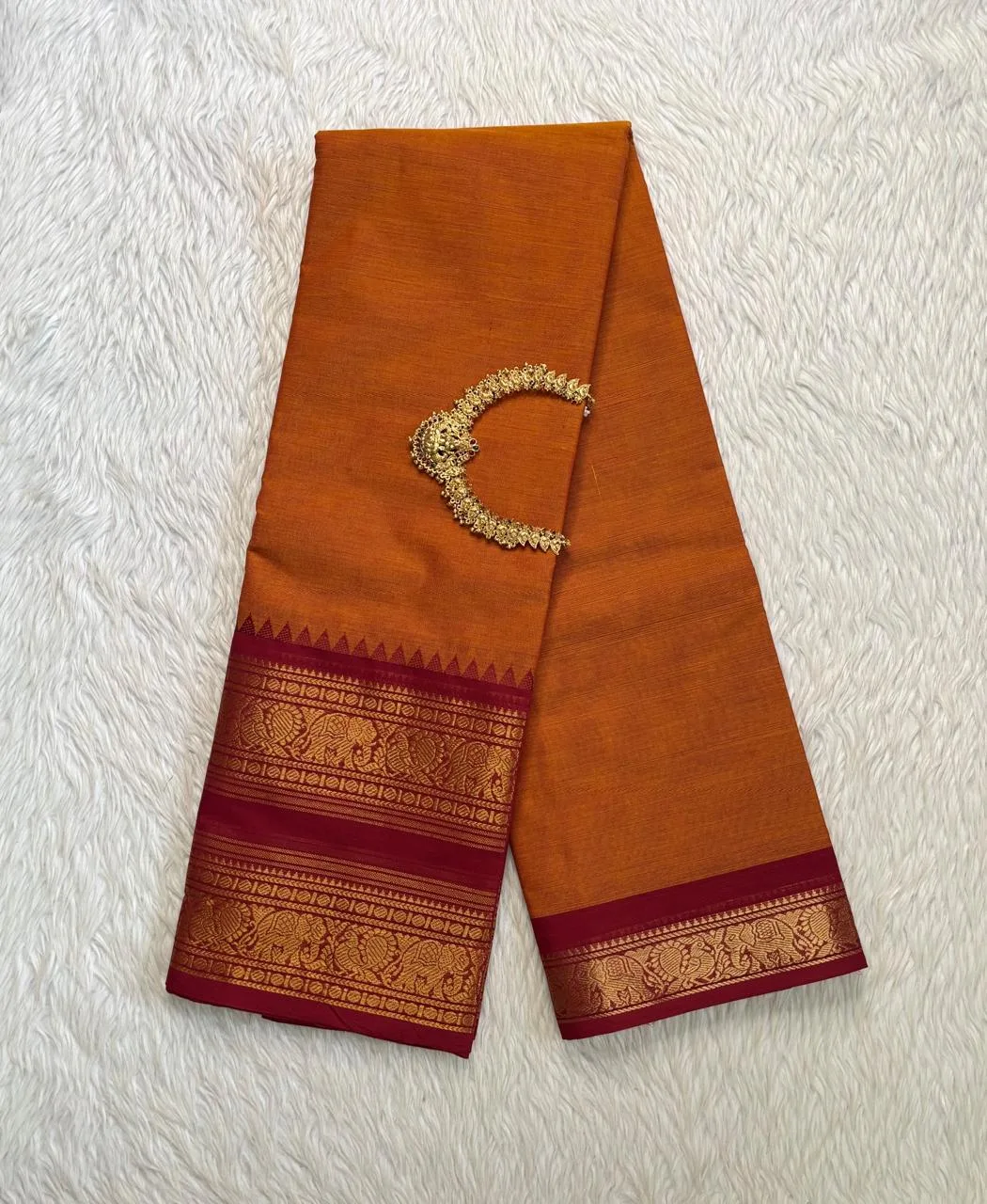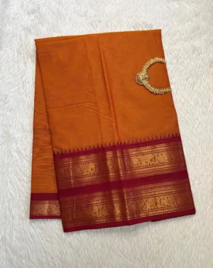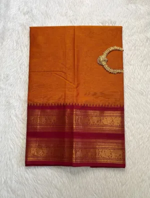 kanchi cotton saree with Running Blouse – Kanchi cotton -Yellowish orange with red(peacock border)
