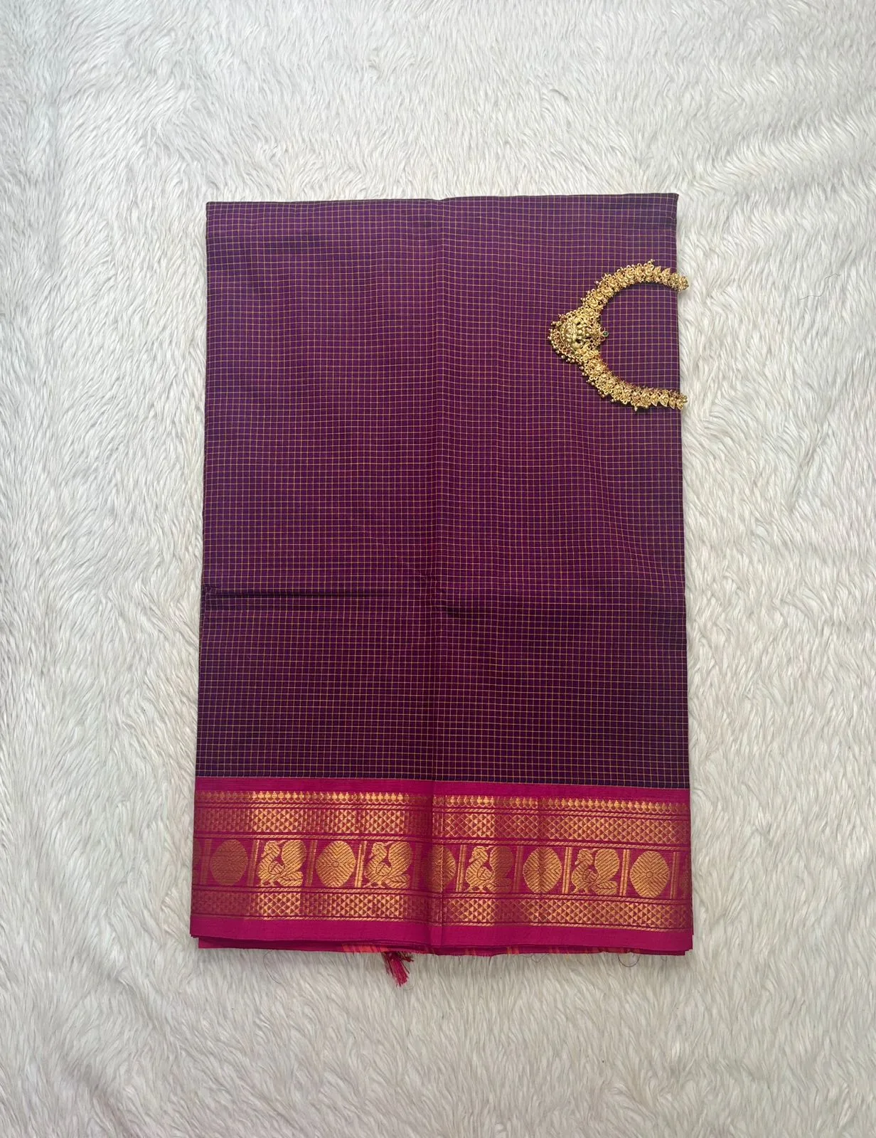 kanchi cotton saree with Running Blouse- Small Border- Purple with Rani pinkColour-kanchi Cotton